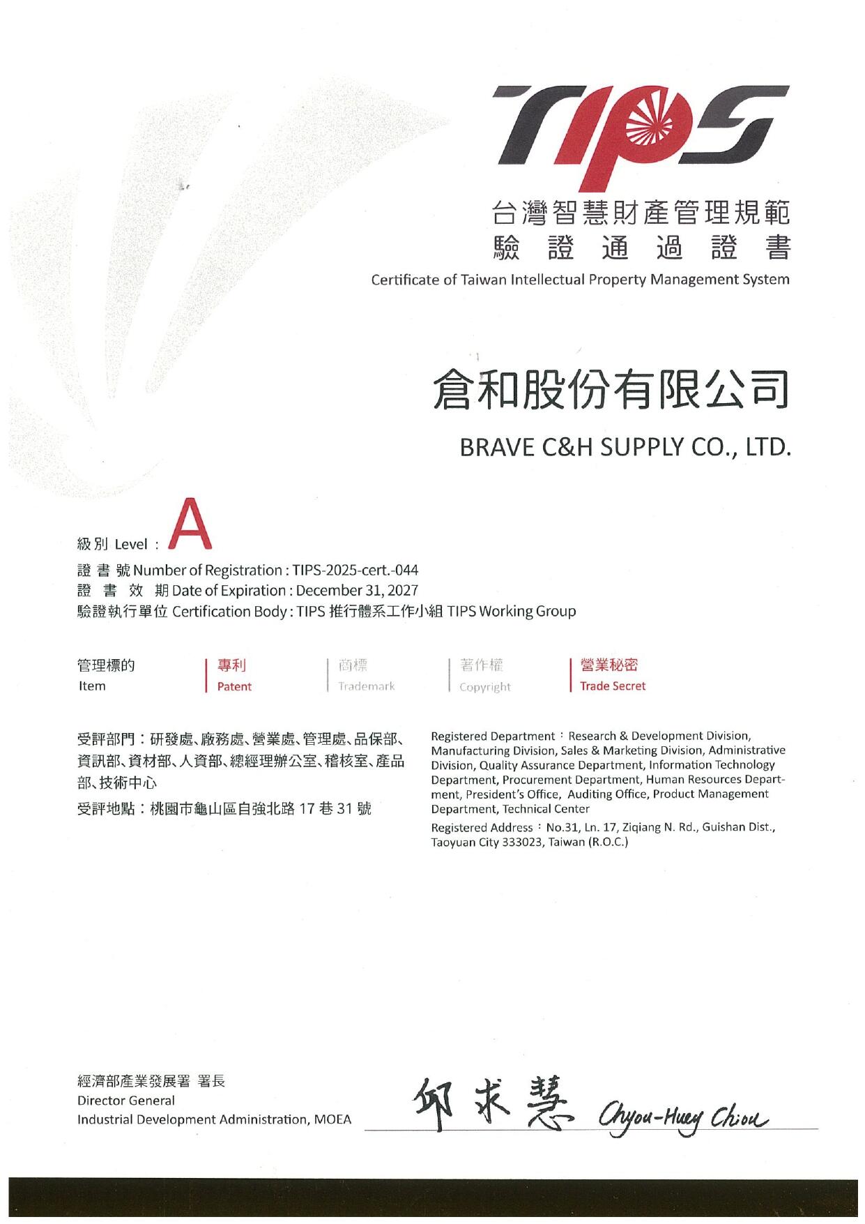 Taiwan Intellectual Property Management System (TIPS) A-level certification